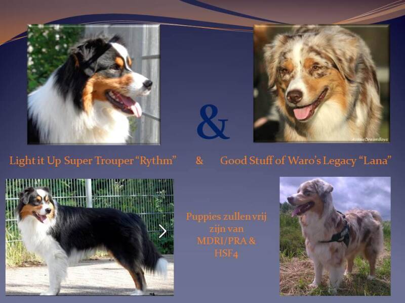 Medio September 2015 wordt ons 2e nestje australian Sheperd pups verwacht uit de combinatie "Lana" Goodstuff of waro`s legacy & "Rythm" Light It Up Souper Trouper Puppies zullen vrij zijn van MDR1/Pra & Hsf4